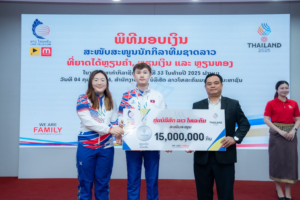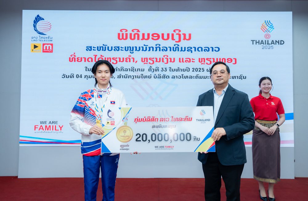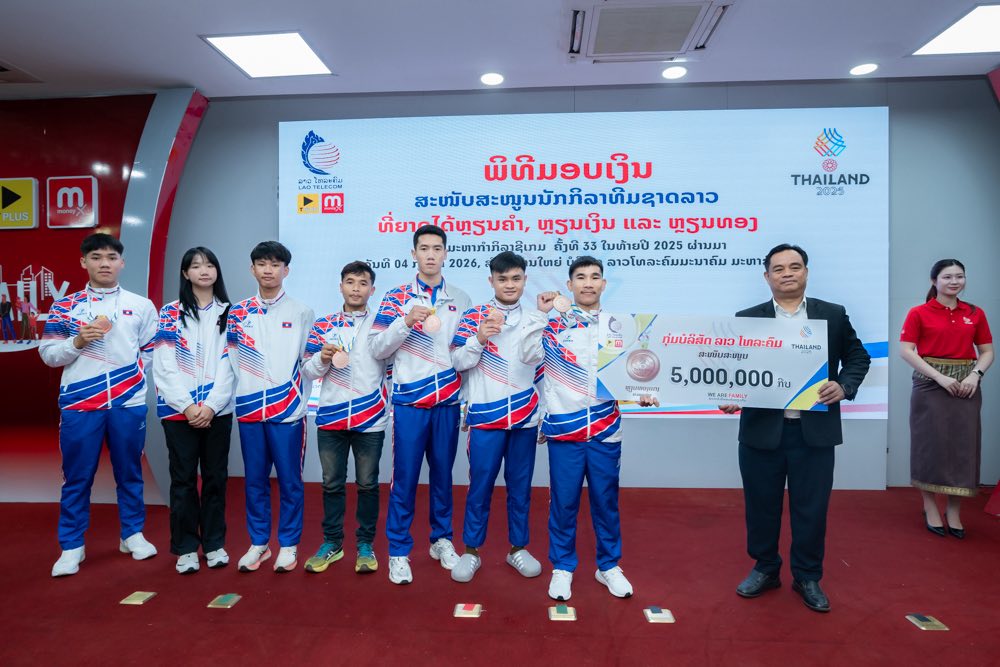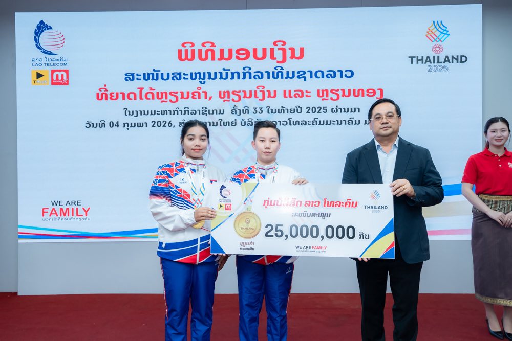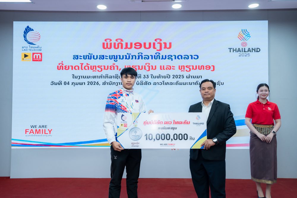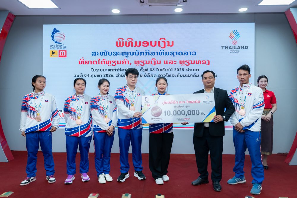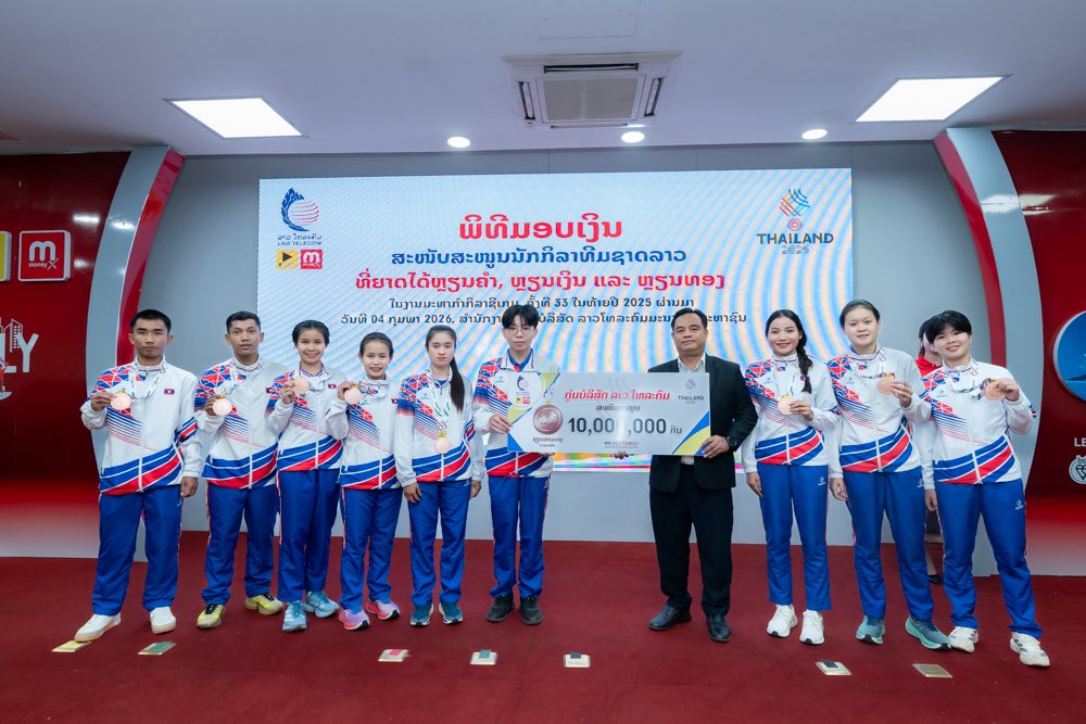 ໃນຕອນເຊົ້າ ຂອງ ວັນທີ 04 ກຸມພາ 2026 ກຸ່ມບໍລິສັດ ລາວ ໂທລະຄົມ ໄດ້ຈັດພິທີສະແດງຄວາມຍິນດີ ແລະ ມອບລາງວັນສະໜັບສະໜູນເພື່ອເປັນຂວັນກຳລັງໃຈໃຫ້ແກ່ນັກກິລາທີມຊາດລາວ ທີ່ສ້າງຜົນງານອັນໂດດເດັ່ນໃນການແຂ່ງຂັນກິລາຊີເກມ (SEA Games) ຄັ້ງທີ 33 ທີ່ຣາຊອານາຈັກໄທ ໃນລະຫວ່າງວັນທີ 9-20 ທັນວາ 2025 ທີ່ຜ່ານມາ.